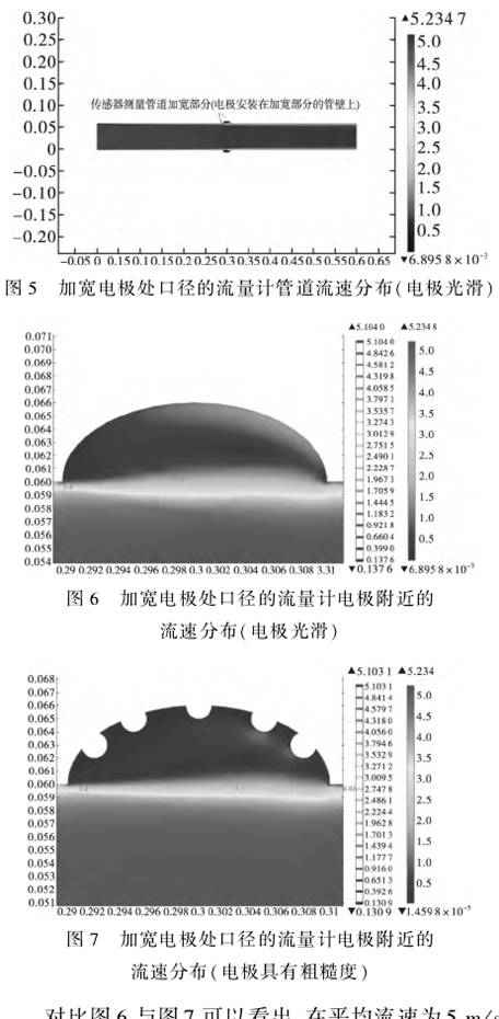 對比圖6和圖7,可以看到平均流速為5m/s的條件下,加寬電極后管道尺寸,基本測量電極附近的流場不受電極表面粗糙度的影響,所以 可以避免電磁流量計傳感器引起測量誤差的電極表面粗糙度,從而證明該方案的可行性。