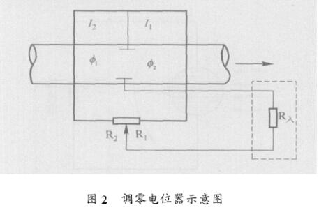 在污水電磁流量計(jì)變送器的結(jié)構(gòu)中,應(yīng)使閉環(huán)的平面與交變磁力線保持平行,以避免磁力線通過閉環(huán),并應(yīng)設(shè)置千擾調(diào)節(jié)機(jī)構(gòu),以減少千擾。干擾信號ET。另外,在變壓器干式饋線上設(shè)置零電位器。如圖2所示。兩根導(dǎo)線從一個電極引出,分別繞過磁極形成兩個回路。當(dāng)磁力線被共同保護(hù)以通過閉合回路時,有必要在兩個回路中沿相反的方向產(chǎn)生感應(yīng)電勢。因此,在兩個回路中存在相反方向的電流I1和I2。通過調(diào)節(jié)零電位器,R輸入上兩個電路中的電流I1和I2產(chǎn)生的電位相互抵消,以減少90°干擾信號。